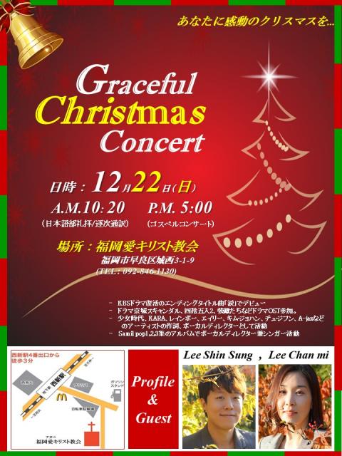 12/22(주일)에 크리스마스콘서트가 있습니다. 오전10:20에는 한일합동예배로 예배중에, 이신성/이찬미 찬양사역자의 특별찬송이 있습니다. 오후5:00에는 이신성/이찬미 찬양사역자의 [크리스마스콘서트]가 있습니다. 오셔서 크리스마스의 큰 은혜 받으세요.